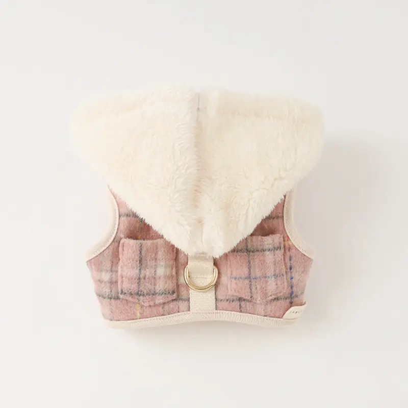 ファーフード付チェックハーネス+リードSET【名入れ刺繍対応】
