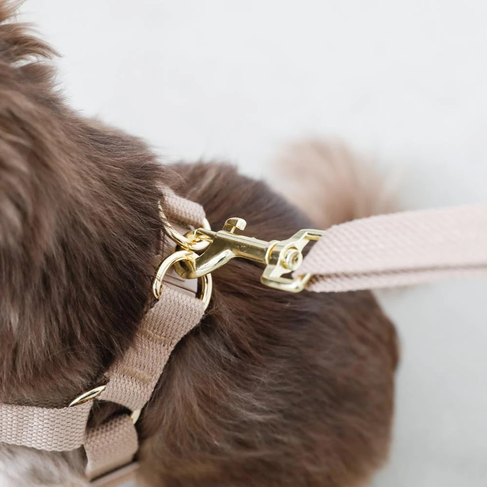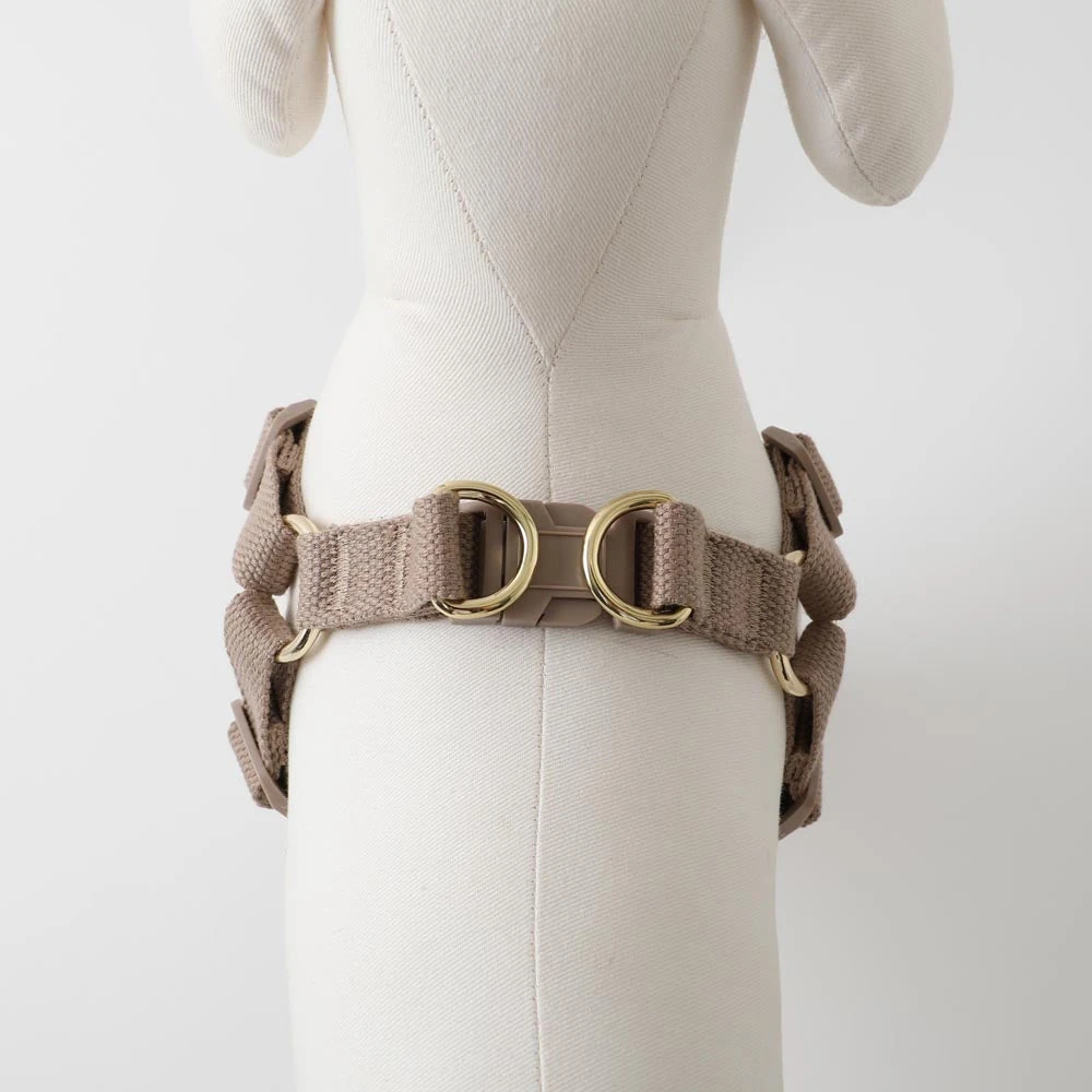 当ハーネスは、見た目の美しさだけでなく、愛犬の快適性を徹底追求しています。通気性に優れたメッシュ素材を内側に使用することで、蒸れや肌荒れを防止。ストラップ部分にはクッション素材を採用し、長時間の使用でも負担を軽減します。Dカンは強化ナイロン製で、引っ張りに強く、突然の衝撃にも耐えられる構造です。